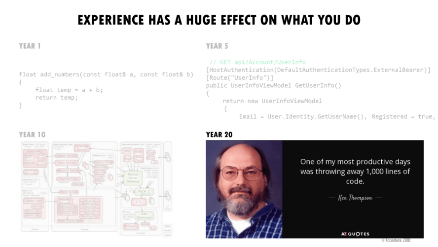 Zaman ilerledikçe yazılımcının yaptığı işin değiştiğinden de bahseden Uğur Turan şu şekilde örnekler veriyor; ilk sene kolay kodlar, beşinci sene ise daha zor kodlar yazılıyor. Onuncu senede işin mimari kısmı ortaya çıkarken yirminci senede kod silme öne çıkıyor. Turan son olarak, iyi bir yazılım geliştiriciysen aranan kişi olacağını da belirtiyor.