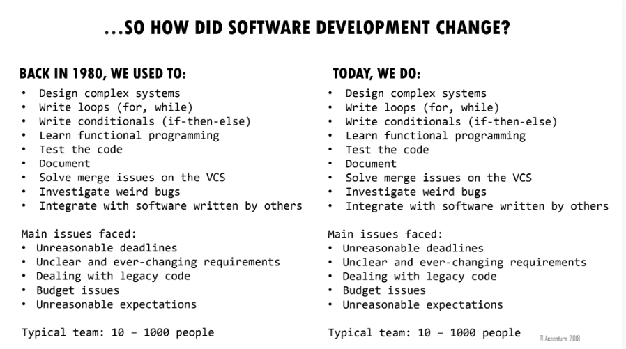 Yazılım geliştiriciliği 1980'den günümüze herhangi bir değişiklik göstermiyor. Ortaya çıkanlar da, karşılaşılan sorunlar da hemen hemen aynı şekilde ilerliyor. Bulut, blockchain, yapay gerçeklik, makine öğrenimi gibi teknoloji ürünlerinden de bahseden Uğur Turan, bunların bazılarının da yeni icat edilmediğini, ancak gün geçtikçe geliştiklerini söylüyor.