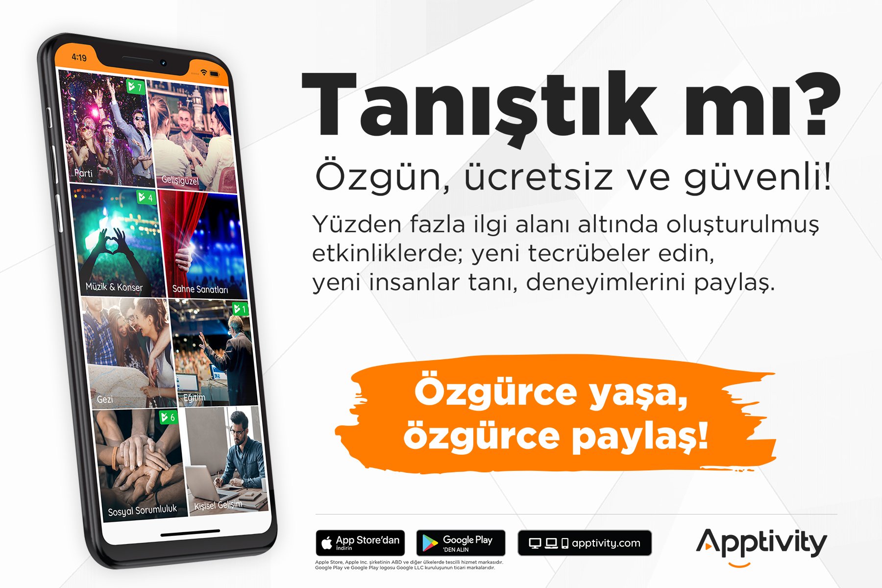 Ücretsiz ve güvenli sosyal etkinlik uygulaması Apptivity ile gezi, spor, sahne sanatları, parti, eğitim, kişisel gelişim ve yüzden fazla ilgi alanı altında oluşturulmuş etkinliklere kolayca ulaş, ücretli yada ücretsiz, kapalı yada herkese açık özgün etkinlikleri oluştur.