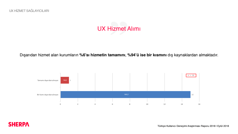 Rapora göre 2017 yılına kıyasla, 2018 yılında kurumların dışarıdan hizmet alma oranları düşerken; UX süreçlerini kurum içindeki profesyonellerle yürütme oranları arttığı gözlemleniyor. Kurumların yüzde 33'ünün UX süreçlerini kurum içi UX ekibiyle yürütmesi dikkat çekerken, kurumların, hizmetin tamamını dışarıdan alma oranlarının ise yüzde 6 oranında olduğu görülüyor.