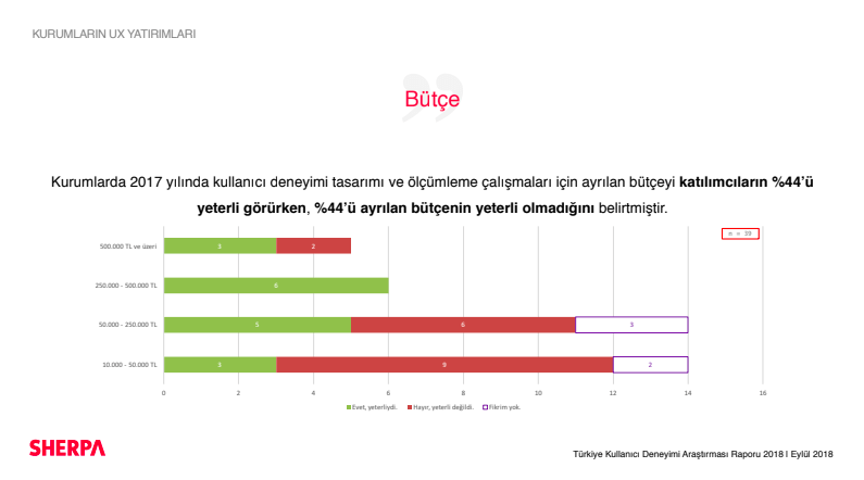 Raporda bir önceki yıla kıyasla, kurumların yüzde 64'ünün UX tasarımı ve ölçümlemesi için ayırdığı bütçeyi arttırdığı görülüyor. Aynı şekilde yine bir önceki seneye kıyasla UX için ayrılan bütçenin artmasına karşın, katılımcıların yüzde 50’si 2018 yılında bütçenin yeterli olmadığını düşündüğünü söyleyelim.