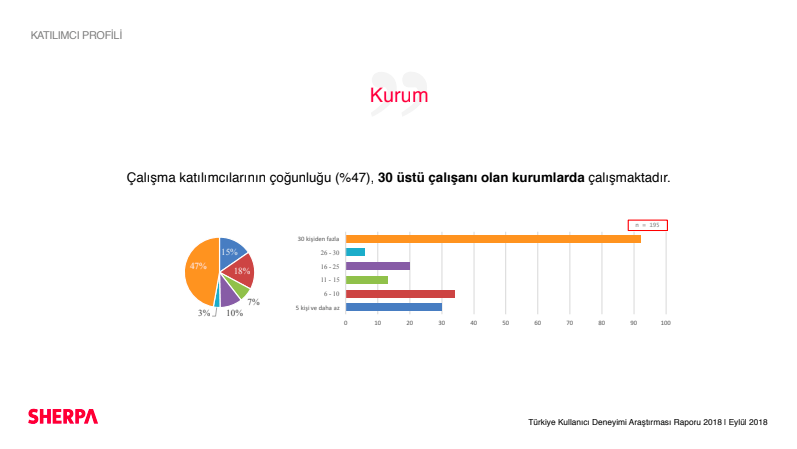 2018 yılının üçüncü çeyreğinde bilgi teknolojilerinden perakendeye finans sektöründen sigorta, otomotiv ve turizme kadar 13 farklı sektörde, 303 kurumsal firma arasında, ağırlıklı olarak C Level ve Ürün & Servis birim yöneticileriyle gerçekleştirilen kullanıcı deneyimi araştırmasına göre kurum içindeki UX ekiplerinin yaygınlaştığı ortaya çıktı.