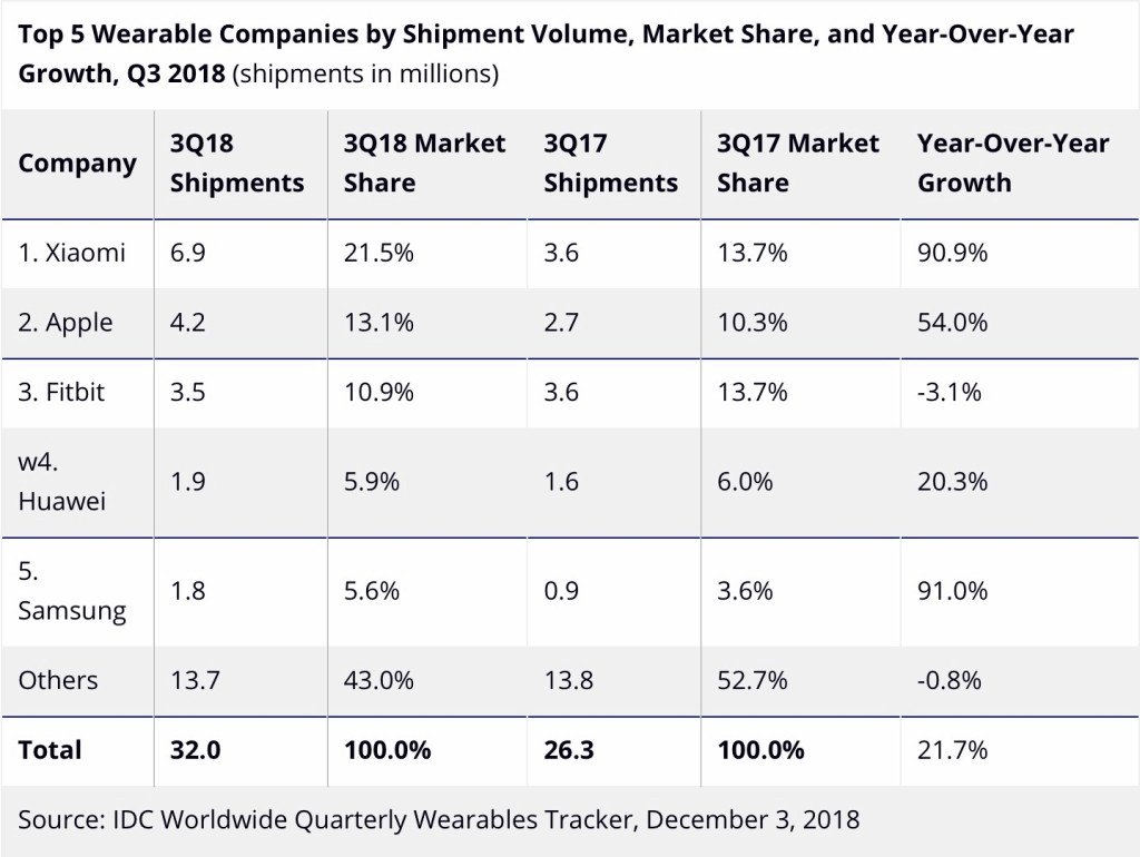 IDC tarafından paylaşılan bilgilere göre Xiaomi, 2018 yılının 3. çeyreğinde toplamda 6,9 milyon adet giyilebilir teknoloji satışı yaparak giyilebilir teknoloji pazarının lideri oldu. 2017 yılının 3. çeyreği ile kıyaslayacak olursak Xiaomi'nin satışları yüzde 90,9 oranında yükseldi.