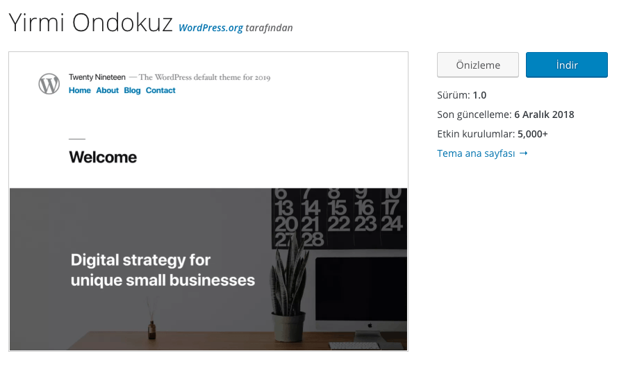 WordPress 5.0 versiyonu ile yeni varsayılan tema Yirmi Ondokuz’u da tanıtmış oldu. Çok çeşitli amaçlar için kullanılabilir hale getirilen tema daha modern bir tasarıma sahip ve blok tabanlı yeni editöre tam uyumluluk ile geliyor. Bir çok WordPress kullanıcısının sorunu olan yavaş yüklenme problemini hafifletmek için ise sistem fontlarını kullanıyor.