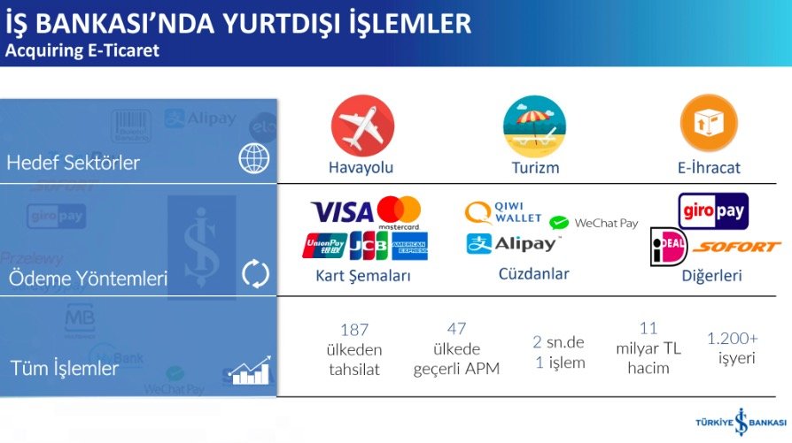 Türkiye İş Bankası'nın yurt dışı işlemlerinde özellikle havayolu, e-ihracat ve turizm sektörlerini hedef aldıklarını ileten Kutacun, bu sektörler için ürün ve hizmetler geliştirdiklerini de belirtti. 2018 yılının ilk 10 ayında 187 farklı ülkeden yurt dışı ödemesi aldıklarını da sözlerine ekleyen Kutacun, her 2 saniyede yurt dışından ödeme aldıklarını ve toplamda 11 milyar TL ödeme almayı başardıklarının da altını çizdi.