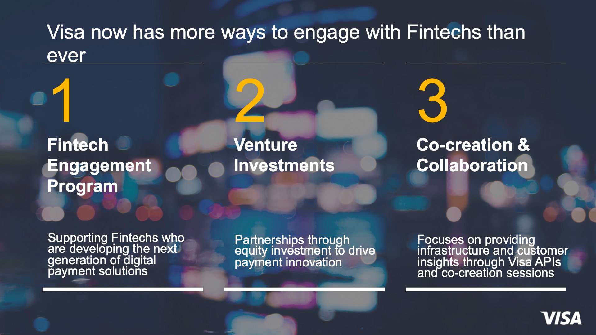 Visa’nın bir güven ağı işlettiğini vurgulayan Sowani, fintechler ile birlikte yeni nesil finansal çözümlere daha kolay erişim sağlanabileceğini ve ödemeler dünyasının gelişebileceğini belirtti Sowani, Visa’nın inovasyon merkezlerinin San Francisco, Londra, Tel Aviv, Berlin, Singapur, Dubai, Miami ve New York’ta bulunduğunu ve şirketin fintech’lerle çalışmaya devam edeceğini söyleyerek konuşmasını tamamladı.