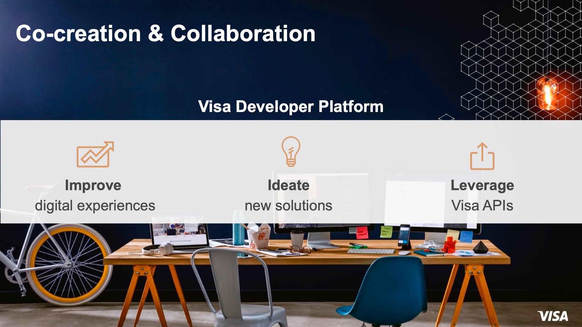 Visa API ve SDK'leri aracılığıyla girişimlere küresel finansal uygulamalar geliştirme imkanı sunuyor. Mobil ekranlarımız sayesinde tüm dünyanın önümüzde olduğunu belirten Sowani, Visa'nın 60 yıl önce parayı elektronik hale getirmesiyle bir anlamda ilk fintech olduğunun da altını çiziyor. Sowani, son 60 yılda kart sayısı 3,3 milyar ve ticaret yapan kişi sayısı 54 milyonla sınırlıyken, önümüzdeki 5 yılda nesnelerin interneti, mobil teknolojilerin yayınlaşması, Wi-Fi, parmak izi gibi 30'dan fazla ödeme yönteminin olacağını ve bu ödeme yöntemlerinin kabul edileceği 500 milyondan fazla yer olacağını söylüyor.