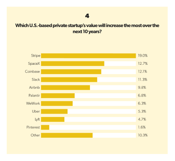 Stripe'ın değerlemesi şu anda 20 milyar dolarlık bir noktada bulunuyor. Ancak ankete katılan girişimciler bunun 10 yıl içinde çok yüksek seviyelere ulaşacağını söylüyor. Katılımcıların yüzde 19'u bu noktada Stripe'ın adını verirken, yüzde 13'ü SpaceX, yüzde 13'ü Coinbase, yüzde 11'i Slack ve yüzde 10'u da tercihini Airbnb'den yana kullanıyor.