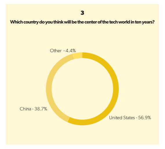 Ankete katılan girişimcilerin yüzde 39'u, 10 yıl sonra teknolojinin merkezinin Silikon Vadisi değil, Çin olacağını söylüyor. Çin'de şu anda 500 milyon internet kullanıcısı bulunuyor ve tüm dünyanın kullandığı birçok uygulama da bir şekilde Çin'le ilişikilendiriliyor. Çin'in özellikle nüfus avantajını düşündüğümüzde bunun çok da yanlış bir öngörü olmadığını söylemek doğru olacaktır.