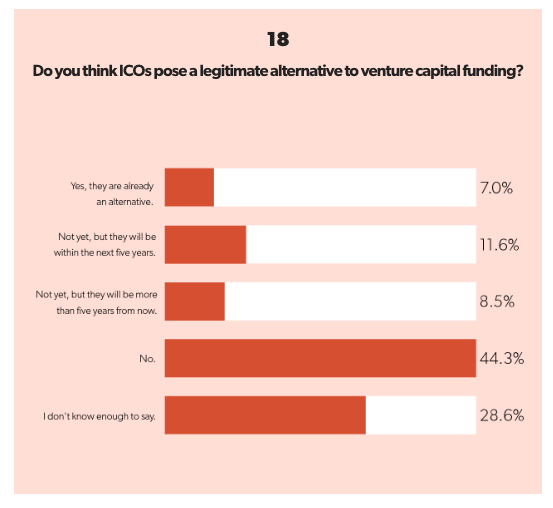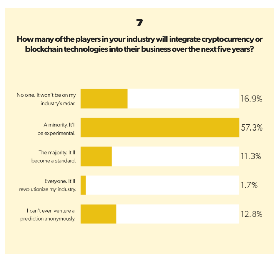 Kripto para dünyası ve blockchain'ler yavaş yavaş sektörü ele geçirmeye başlarken, katılımcıların sadece yüzde 1'i blockchain'in bir devrim niteliği taşıdığını düşünüyor. Girişimcilerin sadece yüzde 13'ü ise blockchain'in gelecekte sektörlerinde baskın teknolojiler haline geleceğine inanıyor. Bu rakamlara rağmen girişimcilerin sadece yüzde 40'ı kripto para birimine sahip olduklarını söyledi.