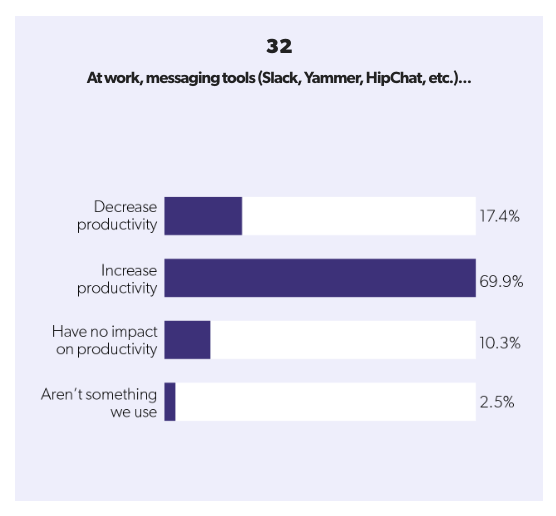 Kurucuların yüzde 70'i, Slack ve Yammer gibi mesajlaşma uygulamalarının iş dünyasında verimi artırdığını söylüyor. Girişimcilerin yüzde 98'inin bu uygulamaları kullandığını düşünürsek bu da pek şaşırılacak bir veri değil aslında.