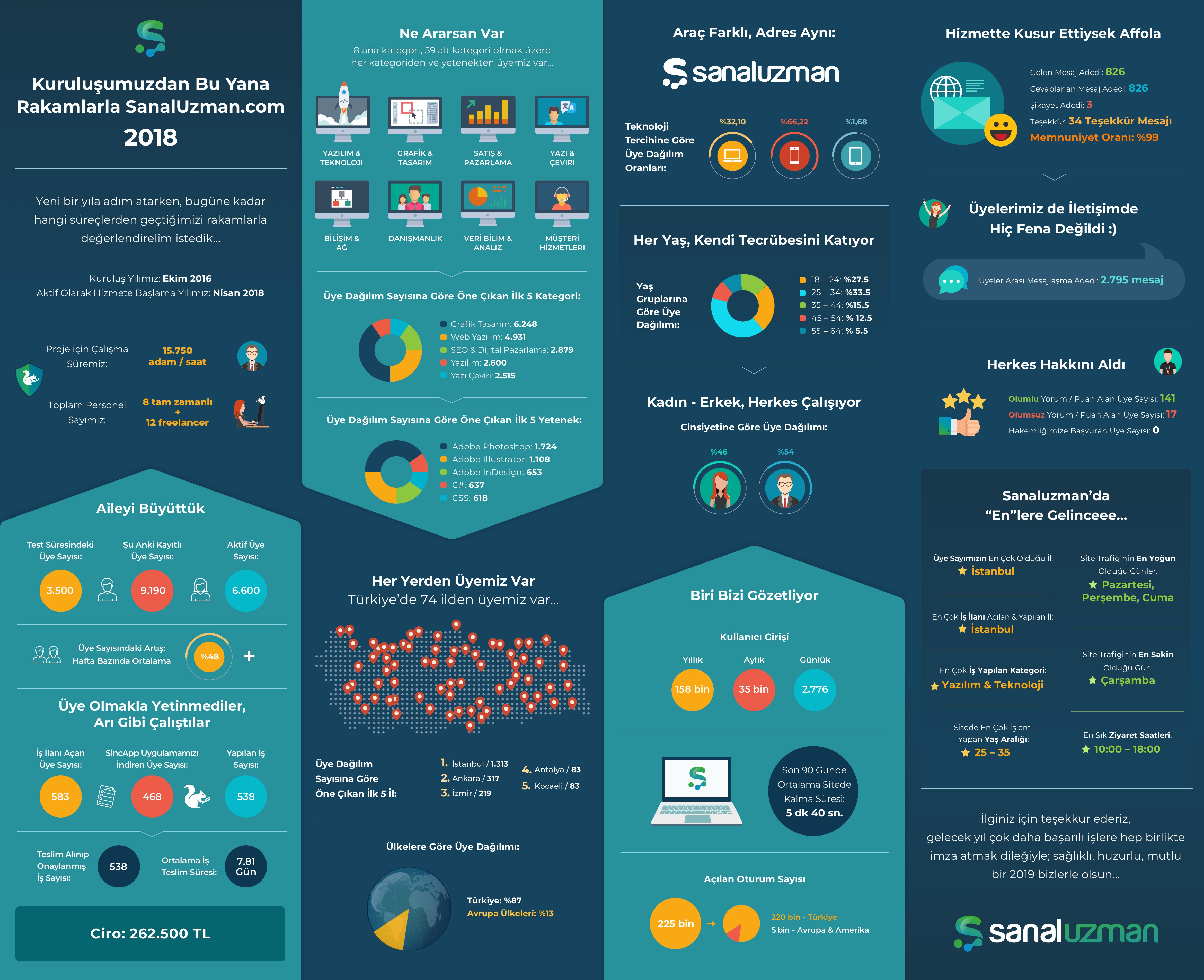 Geçtiğimiz yılın Ekim ayında KOBİ’leri serbest çalışanlarla buluşturan bir dijital iş platformu olan SanalUzman'dan sizlere bahsetmiştik. 2018 yılına dair verilerini bir infografik ile paylaşan SanalUzman, 6 bin 600 aktif olmak üzere toplamda 9 bini aşkın kayıtlı üyeye ulaştı.