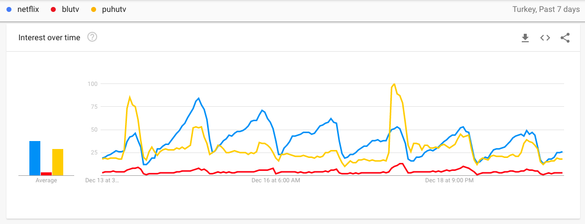 Netflix, puhutv ve BluTV'yi Google Trendler'de kıyasladığımızda, bu yılın başlarında en az ilgiyi BluTV'nin çektiğini görüyoruz. Onu Netflix izlerken, puhutv ise zirvede yer alıyor. Netflix ve BluTV yaz aylarında atağa geçerken, puhutv'nin de düşüşe geçtiğini söyleyebiliriz. Aslında bunun nedeni çok basit. puhutv'nin portföyünde halihazırda televizyonda yayınlanan diziler bulunuyor. Geleneksel televizyon izleyicisi, bu dizileri kaçırdığında ya da herhangi bir kullanıcı bahsi geçen dizileri izlemek isteyip saatler süren reklamlardan sıkıldığında puhutv'de televizyondan bir gün sonra yayınlanan bölümlere yöneliyor. Diziler yazın tatile girdiğinde de puhutv'nin Google'daki aranma oranı da doğal olarak düşmeye başlıyor ve televizyonda izleyecek bir şey bulamayan izleyici de Netflix ve BluTV gibi platformlara yönelmeye başlıyor.
