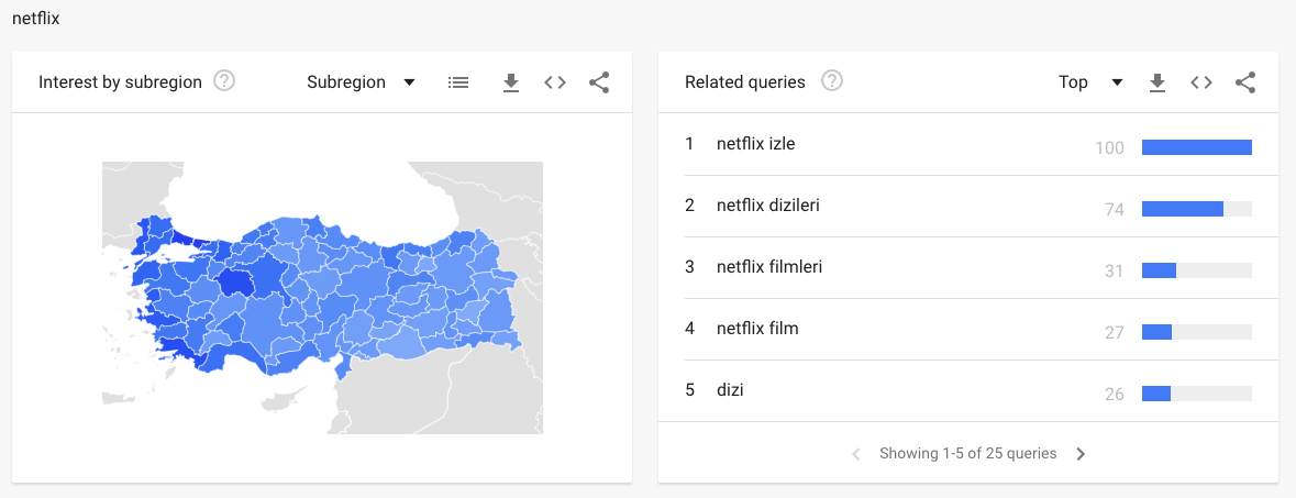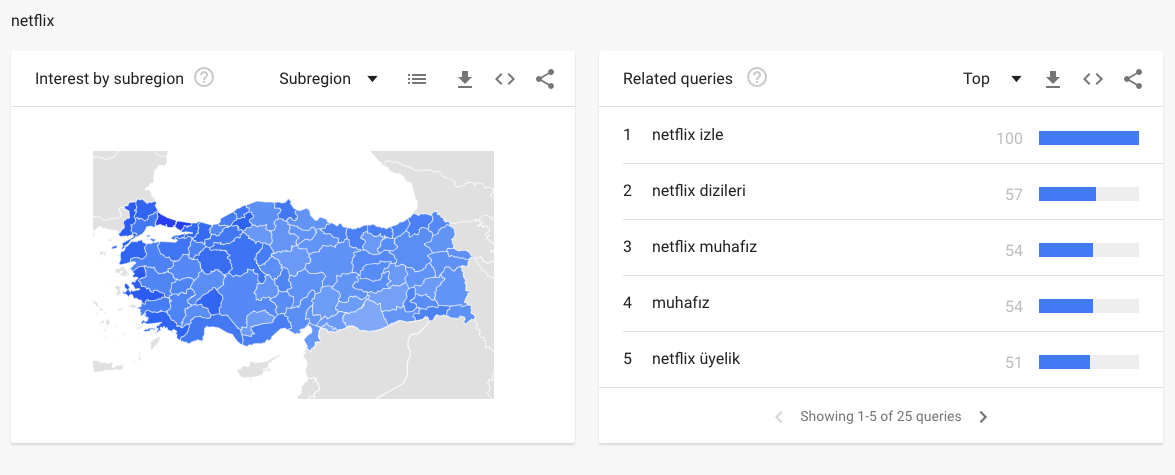 Son 12 ayda ilgili alanda arama motoruna en çok yazılan kelimelere baktığımızda, Netflix için "netflix izle, netflix filmleri, netflix dizileri" gibi daha genel ibareler görüyoruz. Ancak yine Netflix için son 7 güne baktığımızda bizi şaşırtan bir sonuç ortaya çıkıyor. Son haftada en çok aranan kelimeler arasına "netflix muhafız, muhafız, protector" gibi kelimelerin girdiğini görüyoruz.