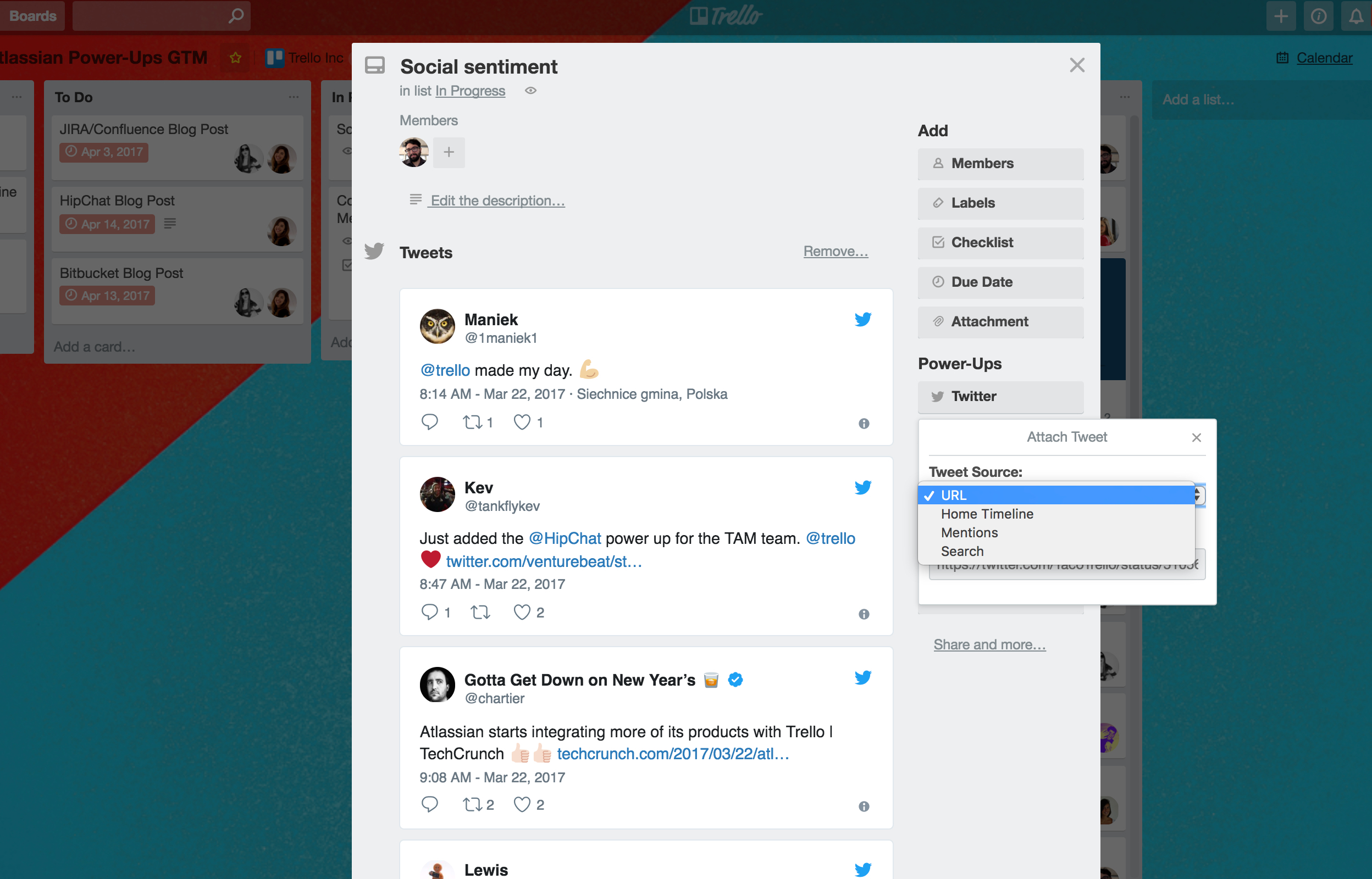 URLler, mentionlar, aramalar üzerinden Tweetleri hızlıca kartlara ekleyebildiğinizi de söyleyelim. Aynı şekilde sürükle bırak yöntemiyle de bu içerikleri kartlara eklemeniz mümkün. Trello’ya eklediğiniz Tweetlerde Beğeni, Retweet ve cevaplama eylemlerini gerçekleştirebiliyorsunuz.