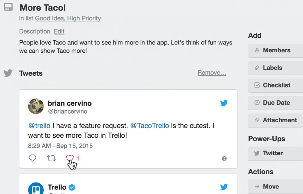 Pazarlama, destek, satış veya ürün bölümlerinin faydalanabileceği bu Power-Up, müşterilerinizin sosyal ağlarda dile getirdiği sorunları yönetmenizi sağlıyor. Aynı zamanda özellik isteklerinin kolayca görüntülenebildiği bu power-up’ta topluluk yönetimi de doğrudan Trello üzerinden yapılabiliyor.