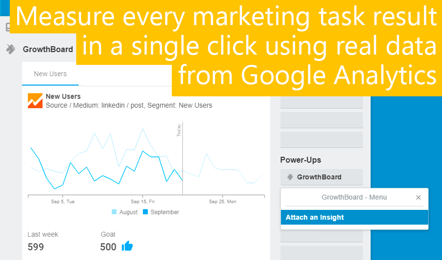 Growth Hacker Power-Up’ı ile Facebook reklamları, GA, Mixpanel, Twitter reklamları, Kissmetrics, Amplitude, Optimizely ve Google Optimize gibi hesaplarınızdaki verilerinizi Trello’da görüntüleyebiliyorsunuz.