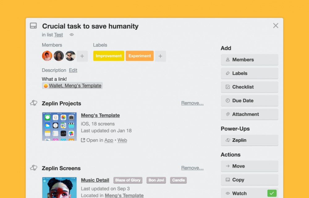 Eğer bir Zeplin kullanıcısıysanız, Trello Power-Up’ını hesabınıza bağlamanız yeterli. Bu bağlantının ardından son projelerinize ve ekranlarınıza hızlıca ulaşabilecek ve onları kolayca kartlara ekleyebileceksiniz.