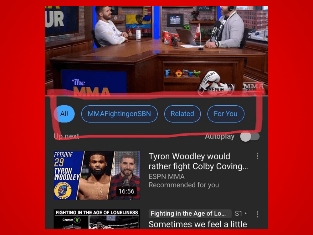 Görselde de görebileceğiniz gibi tek bir MMA videosuna, hepsi, senin için önerilen, konuyla ilgili videolar ve kanalla alakalı videolar olmak üzere dört farklı kategori sunuluyor. Bu özellikle birlikte kullanıcının izlemekte olduğu videonun altında, videonun ait olduğu kanalın geçmişte ürettiğine benzer videolar bulunması mümkün. Aynı şekilde konuyla ilgili videolar ve kanallar seçeneğiyle farklı içerik üreticilerinin aynı konuda ürettiği farklı içerikler de kolayca bulunabilir. Bunun yanı sıra kullanıcıların izleme paternlerine özel olarak videolar önerilebileceğini de belirtelim.