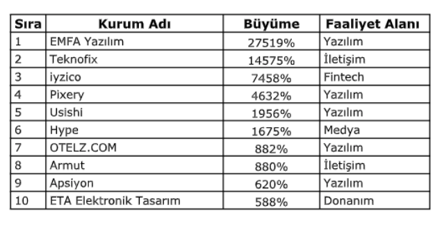 Sıralamada ilk üçe giren EMFA Yazılım Danışmanlık, Teknofix ve iyzico'nun yanı sıra ilk 10'a giren teknoloji şirketlerini aşağıda bulabilirsiniz. Raporu merak edenler daha detaylı bir şekilde buradan inceleyebilirler.