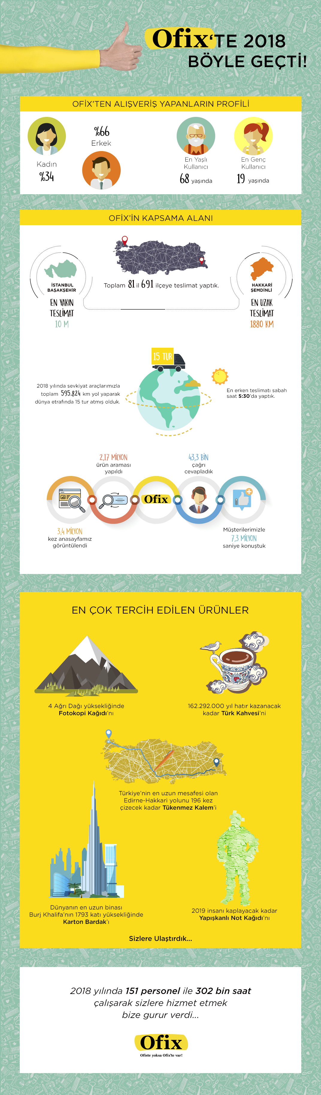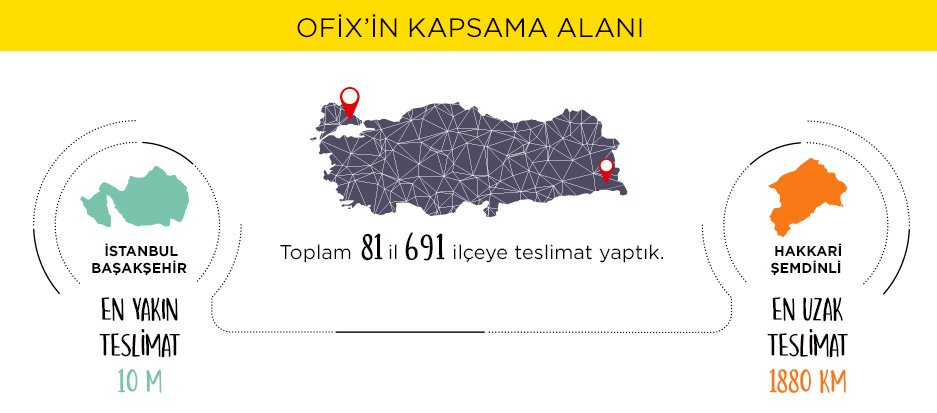 Toplamda 81 ilde 691 ilçeye teslimat yapan Ofix.com'un en yakın teslimatı İstanbul'un Başakşehir ilçesinde olurken, en uzak teslimatı da Hakkari'nin Şemdinli ilçesine oldu. Ofix.com, 2018 yılında sevkiyat araçlarıyla toplamda 595 bin 824 kilometre yol katetti. En erken teslimat ise sabah 5:30'da gerçekleşti.