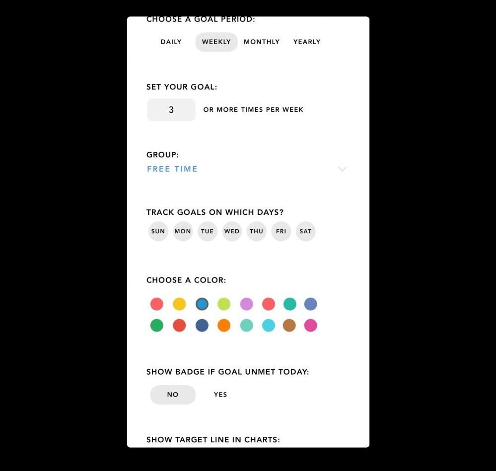 Aynı şekilde belli gruplar oluşturarak bir çok alışkanlığı aynı grubun içinde takip edebilmeniz mümkün. Oluşturacağınız dosyada hedef periyodu atamanız, haftanın belli günlerinde bu hedefi takip edeceğinizi belirtmeniz de söz konusu.