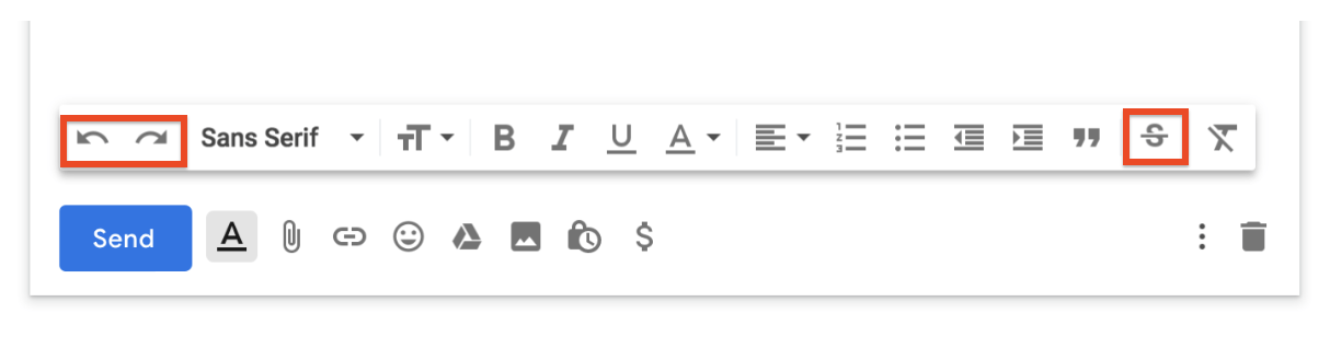 Gmail bu kısayolları e-posta oluşturma penceresindeki biçimlendirme seçenekleri çubuğuna ekliyor. En solda bulunan kısımda kullanıcılar, artık klavye komutları yerine undo/redo düğmesini kullanarak yazıları geri alıp yineleyebilecekler. Ayrıca kullanıcı geri bildirimlerinden yola çıkan Gmail, şeridin diğer tarafına da bir çizgi ekliyor. Bu da yazıların üstünün çizilmesine olanak sağlayacak.