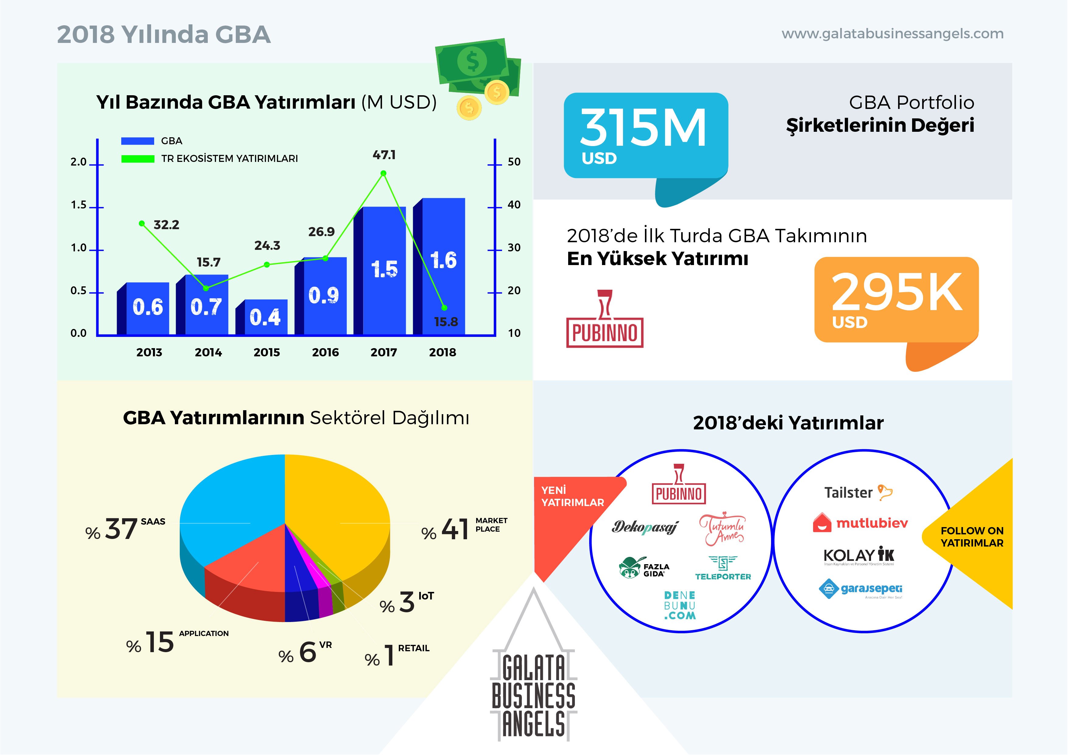Portföyüne, Denebunu.com, Dekopasaj, Tutumluanne, Fazla Gıda, Teleporter ve Pubinno gibi girişimleri de ekleyen Galata Business Angels'ın portföyünde bulunan şirketlerin toplam değeri ise 2018 yılı sonunda 315 milyon dolara ulaştı. GBA’nın ilk nesnelerin interneti donanımı yatırımı olan Pubinno'nun GBA üyelerinden aldığı 295 bin dolarlık yatırım ile GBA portföyünde ilk turda en yüksek yatırım alan girişim olduğunu da ekleyelim.