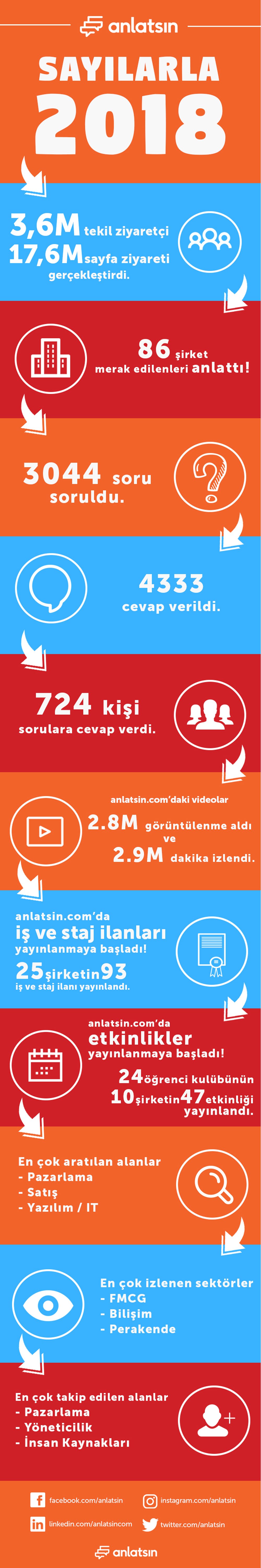 Anlatsın.com'da son 1 sene içinde, 3,6 milyon tekil ziyaretçi, 17,6 milyon sayfa ziyareti gerçekleştirdi. Toplamda 86 şirket çalışanlarıyla beraber hakkında merak edilenleri anlattı. Kullanıcılara kariyer ve eğitim alanında 3 bin 44 soru soruldu, 724 kişi tarafından 4 bin 333 cevap verildi. Anlatsın.com'da yayınlanan videolar 2,8 milyon görüntülenme aldı ve 2,9 milyon dakika izlendi. Anlatsın.com'da 2018 yılında iş ve staj ilanları da yayınlanmaya başlandı. Toplam 25 şirket 93 iş ve staj ilanını Anlatsın kanalıyla duyurdu. Ayrıca bir başka yeni özellik olan, Etkinlikler sayfası da kullanıma açıldı, 24 öğrenci kulübü, 10 şirket toplam 47 etkinlik yayınladı, başvurularını Anlatsın'dan topladı. Anlatsın'da en çok aratılan alanlar ise Pazarlama, Satış ve Yazılım/IT oldu. En çok merak edilip izlenen sektörler FMCG, Bilişim ve Perakende oldu. İçerikleri en çok takip edilen alanlar ise Pazarlama, Yöneticilik ve İnsan Kaynakları oldu.