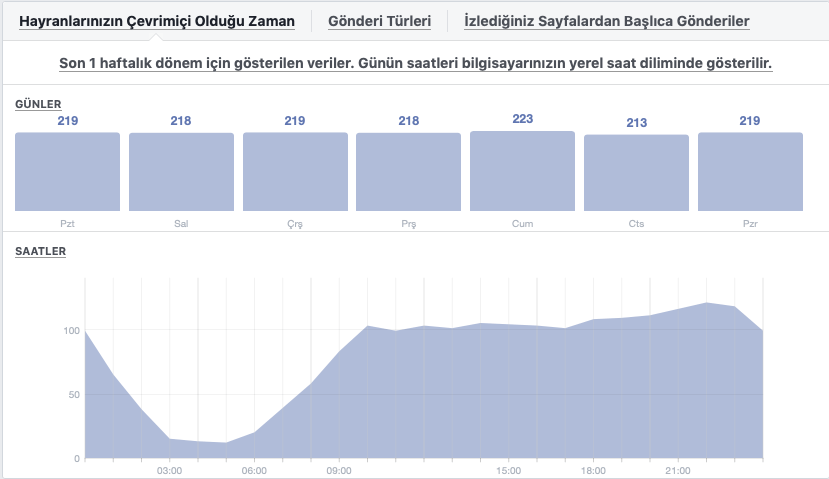 Takipçilerinizin aktif olduğu saatleri tespit etmek için Facebook Sayfanızın İstatistikler bölümümden faydalanabilirsiniz. Gönderiler kısmında yer alan bu veriler sayesinde içerik girişlerinizi burada verilen saatlere göre düzenleyebilir, daha fazla etkileşim alabilirsiniz.