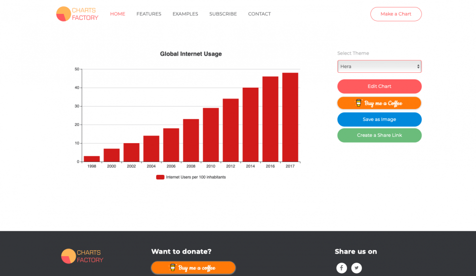 Charts Factory her hangi bir veri tabanı bağlantısına ihtiyaç duymadan birden fazla formatta tablo oluşturmanızı sağlıyor. Verileri kolayca ekleyebildiğiniz Charts Factory'de hızlıca tablo türlerini değiştirebiliyor ve istediğiniz renkleri seçebiliyorsunuz. Charts Factory'de oluşturduğunuz tabloları görsel olarak indirebileceğiniz gibi link üzerinden paylaşabileceğinizi de ekleyelim.