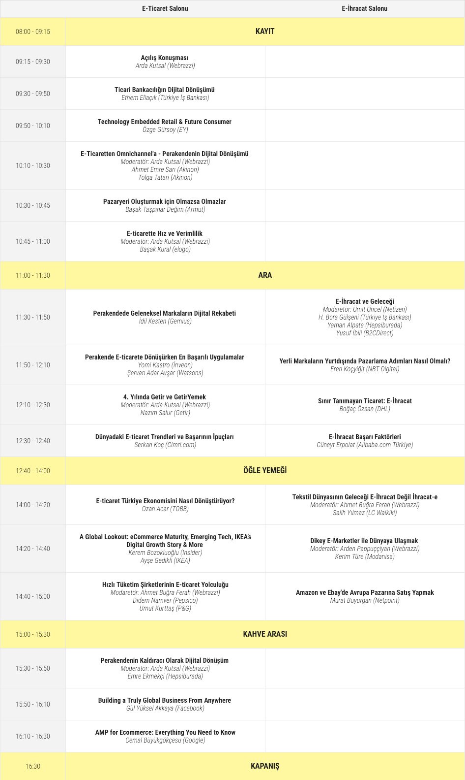 İki salonda tüm gün boyunca gerçekleşecek konferansımızda, perakendede geleneksel markaların dijital rekabeti, e-ticaret dünyasında yaşanan rekabet, pazar yerleri vazgeçilmez konular arasında yerini alıyor. Bu yıl çift salonda gerçekleştireceğimiz etkinliğin gündeminde e-ihracat olacak. Tüm gün e-ihracat salonunda yerli markaların yurtdışındaki pazarlama adımları, cross border marketing, lojistik yönetimi de dahil olmak üzere merak ettikleriniz dair merak ettikleriniz önemli konuşmacılarıyla birlikte Webrazzi E-Ticaret 2019’da olacak.