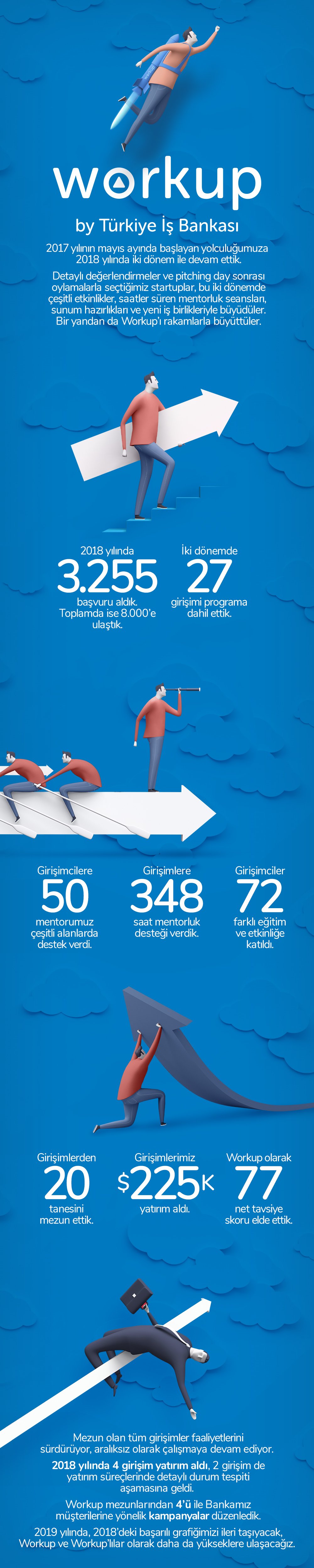 Bugüne kadar toplam 8 binin üzerinde başvuru alan Workup’ta, dördüncü dönem için değerlendirilen 2 bine yakın başvuru arasından seçilen 23 girişim, Workup takımı, mentorları ve İş Bankası grubundan yöneticilerin bulunduğu jüriye sunum yaptılar. İş modellerini, takımlarını, hedeflerini ve programdan beklentilerini jüriye anlatan girişimlerden en yüksek puanı alan 12 girişim programa kabul edildi. 2018 yılına ait daha fazla detayı yazının sonunda yer alan infografikte bulabilirsiniz.