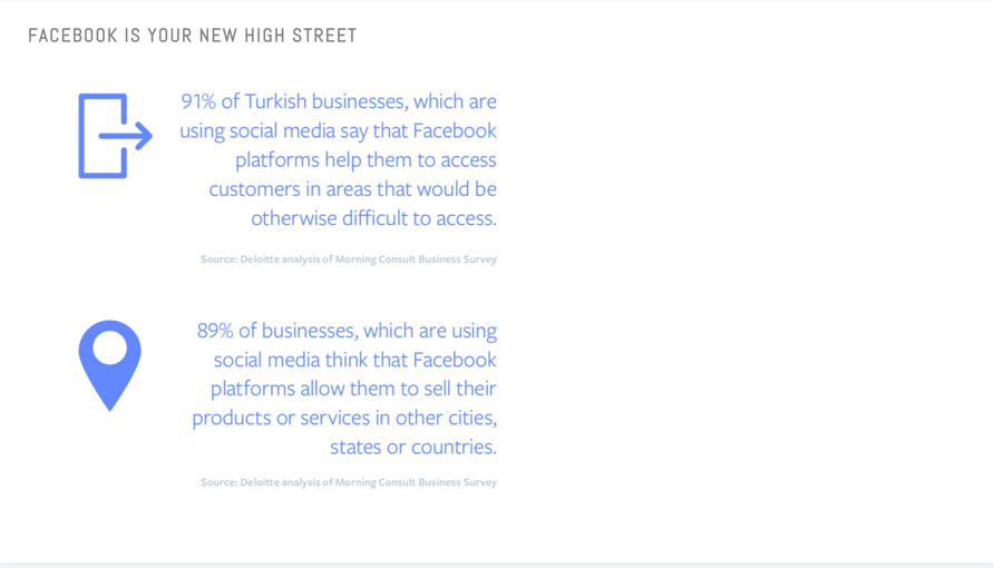 135 milyon insanın Türkiye'de bir işletmeyle bağlantılı olduğunu belirten Akkaya, global hedef kitle ve global müşteri kavramlarını detaylandırdı. Akkaya, Türkiye'de 1.7 milyon küçük ölçekli işletmenin yüzde 91'inin normalde ulaşamayacağı ülke ve şehirlere Facebook üzerinden ulaştığını ifade etti. Akkaya, aynı şekilde bu işletmelerin yüzde 89'unun da başka ülkeler ve şehirlere Facebook sayesinde ulaşabildiklerini düşündüğünü belirtti.