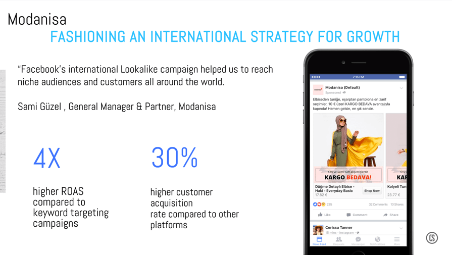 Sunumunda Facebook araçlarını kullanan markaların başarı hikayelerine yer veren Akkaya, Türkiye'den Modanisa'nın hikayesini paylaştı. Almanya için international lookalike özelliğini kullanan Modanisa, ROAS'ını 4 kat arttırırken yüzde 30 oranında daha fazla müşteriye ulaştı.