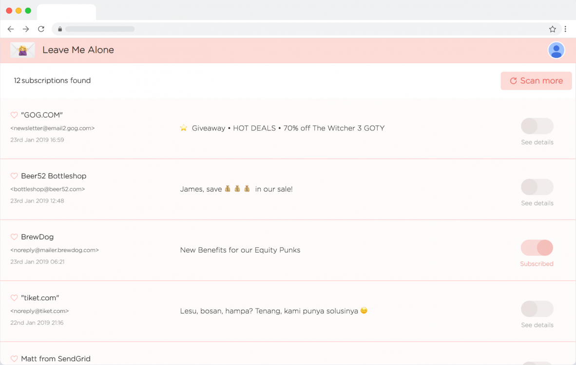 James Ivings ve Danielle Johnson'ın oluşturduğu Leave me alone, e-posta aboneliklerinizi tek tıkla iptal etmenizi sağlıyor. Bunun yanı sıra tüm e-posta bültenlerini tek bir yerde görmenizi sağlayan servis, şimdiye kadar 4 binden fazla kullanıcıya hizmet verdiğini ifade ediyor.