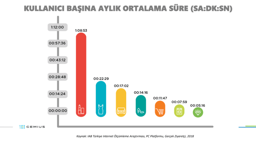 Sosyo ekonomik sınıflandırmada AB ve C1 sınıfları genel olarak ön plana çıkarken beyaz eşyada ise C2'nin önde olduğunu görebiliyoruz. Kullanıcı başına aylık ortalama süreye göz atınca, bir kadının bir ayda herhangi bir kozmetik sitesinde ortalama olarak 1 saat 8 dk harcadığını görüyoruz. Bunun çok büyük rakam olduğunu söylemek mümkün, zira kozmetik sektörünü 22 dakika ile giyim takip ediyor ve arada ciddi bir fark bulunuyor.