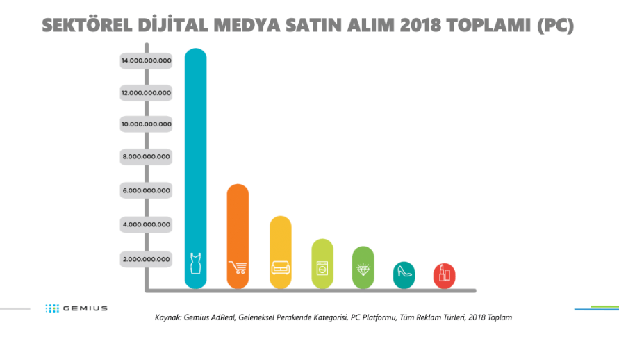 Geleneksel perakendede dijital medya satın alımına bakıldığında ise 2018 yılında, sadece PC tarafında 500 milyarlık bir gösterim karşımıza çıkıyor. Bu gösterimde 7 perakende endüstrisine baktığımızda 43 milyar gibi bir rakam karşımıza çıkıyor. Bu da bahsi geçen sektörlerin toplamın yüzde 8'ini oluşturduğu anlamına geliyor. Dijital medya alım satım 2018 toplamında ise giyim endüstrisinin 14 milyar dolarla başı çektiğini görüyoruz. Bunun da sadece PC tarafında ortaya çıkan bir veri olduğunu söyleyebiliriz.