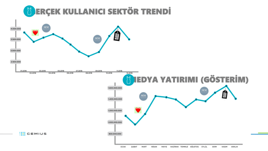 Sektörleri tek tek incelediğimizde giyim sektöründe gerçek kullanıcı trendinde en önemli etkenin Black Friday olduğu karşımıza çıkıyor. Bu dönemde medya yatırımlarının karşılığının da kullanıcı tarafında alındığını belirtelim. Black Friday'i ise 14 Şubat ve yeni sezon dönemleri takip ediyor. Gemius'un verilerine göre, LC Waikiki, Boyner, Koton, Zara ve DeFacto giyim sektöründe öne çıkan şirketler oldu. En çok alışveriş yapan yaş grubunun ise kendi parasını kazanan 25 ve 45 yaş arası kitle olduğunu da belirtelim. Medya yatırımı trendinde ise en çok mart ve mayıs ayları öne çıkıyor. Bunda da Kadınlar Günü ve Anneler Günü'nün etkileri karşımıza çıkıyor.