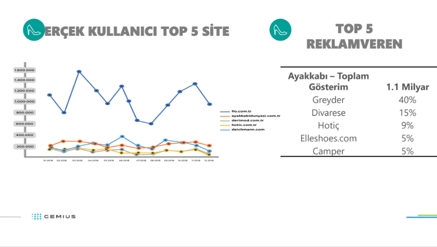 Ayakkabı sektöründeki verilere baktığımızda mart ayında gerçekleşen kış indirimleri ve yeni sezon öne çıkıyor. FLO kullanıcı bazında ilk sıraya yerleşirken medya yatırımında Greyder ve Divarese başı çeken şirketler oluyor. Mobilyada ise evlilik ve üniversite başlangıç dönemleri önem taşıyor. Bu veriye göre en önemli kullanıcı kitlesinin yeni evliler ve üniversite öğrencileri olduğunu da söyleyebiliriz. Mobilya bazında medya yatırımlarında ise Vivense ön plana çıkıyor. Bunun nedeni de şirketin dijitale verdiği önem diyebiliriz.