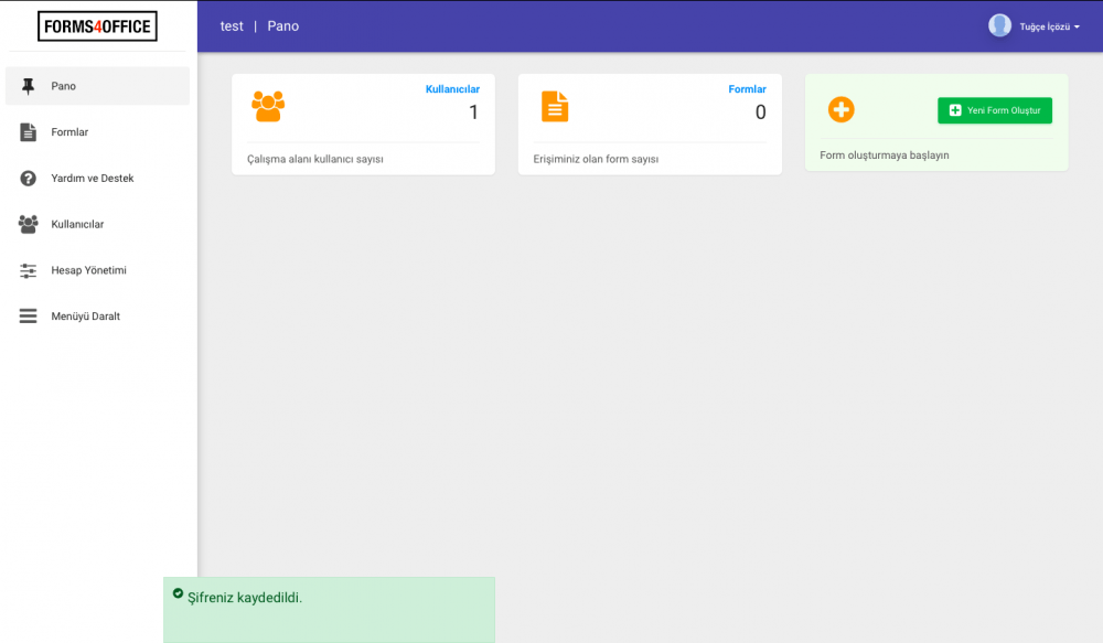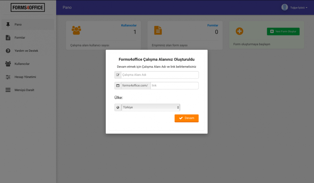 Link ve şifre detaylarını oluşturduktan sonra ise pano ekranıyla baş başa kalıyorsunuz. Bu alandan form oluşturmanız ve oluşturduğunuz formların detaylarını görebilmeniz mümkün.