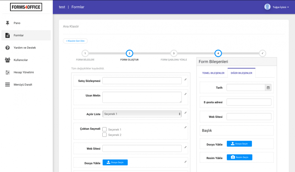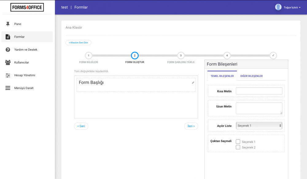 Panonun sağ tarafında yer alan kutucuktan form oluşturmaya başlayabileceğiniz gibi bu işlem için sol taraftaki Formlar başlığına da tıklayabilirsiniz. Bu adımdan sonra karşınıza çıkan ekranda Klasör ve Form oluşturma seçenekleri sunuluyor. Eğer Form oluşturmayı tercih ederseniz 5 farklı süreçten geçeceğinizi belirtelim.