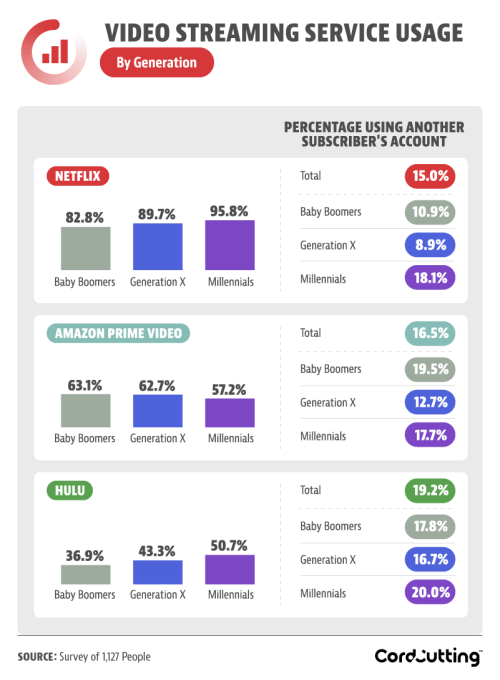 Başkalarının hesaplarını kullananların hangi kuşaktan olduğuna baktığımızda ise karşımıza ilginç bir veri çıkıyor. Netflix'i arkadaşlarından alıp kullananlarda en yüksek dilimi Y Kuşağı oluştururken, Amazon'u kullananlarda yaşlıların -Baby Boomers kuşağı- daha yüksek bir orana sahip olması ciddi anlamda dikkatleri çekiyor. Bu da Amazon'un içeriklerini merak etmemize neden oluyor.