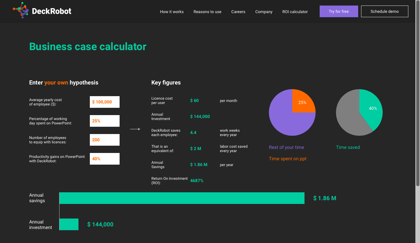 Çalışanların sunum hazırlamakla zaman kaybettiğini fark eden DeckRobot, olası kullanıcıları ikna etmek için web sitesinde bir hesap makinesi de bulunduruyor. Çalışanların maliyetini ve powerpoint üzerinde çalışma saatlerini girebildiğiniz bu hesap makinesi, DeckRobot'un iş yerindeki verimliliği arttırabileceğini gösteriyor.