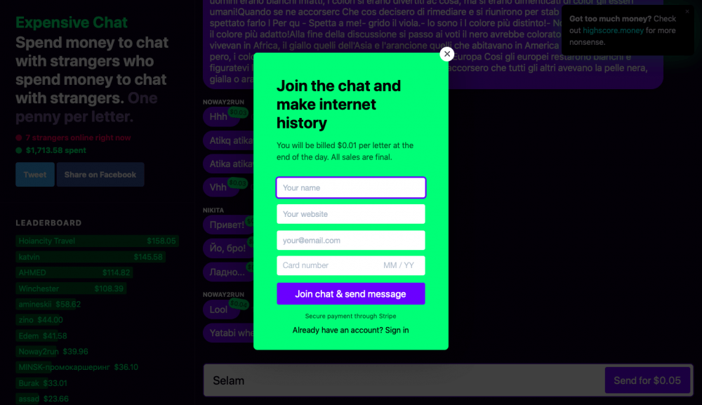 🤑💬 Expensive Chat – Chatroom where you pay https://twitter.com/marckohlbrugge/status/1101044412765790208.01 per letter.