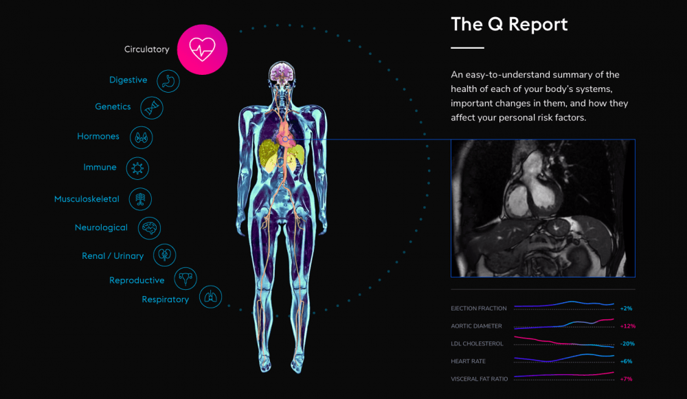 Andressen Horowitz ve Founders Fund'ın yatırım yaptığı Q, hastalıkları henüz ortaya çıkmadan önce tespit ederek önlemek istiyor. Hastalıkları önlemenin, en iyi tedavi yöntemi olduğunu ifade eden girişim, ortaya koyacağı teşhisler için panomics isimli bir Systems Biology yaklaşımını kullanıyor. Böylece görüntüleme yöntemlerinin yanı sıra kimya ve genetik branşlarından faydalanan Q, yaşamsal verilerinizi ve sağlık geçmişinizi bir araya getirerek sağlığınızın ölçülebilir bir portresini ortaya koyuyor.