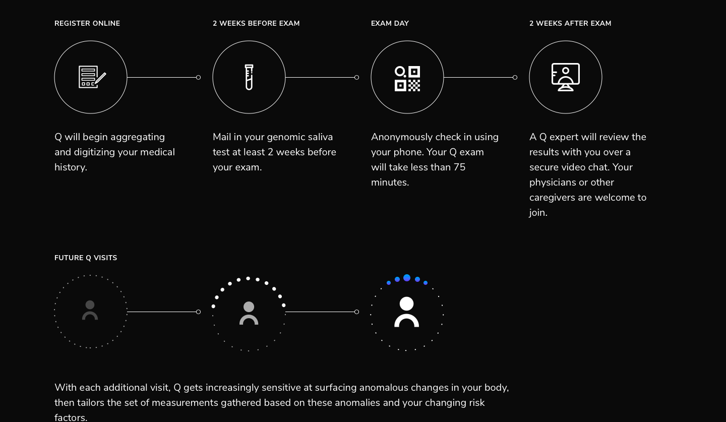 Q'dan faydalanmak isteyen kişiler ilk etapta bir teste tabi tutuluyor. Q Testi adı verilen bu 75 dakikalık süreçte, kişilerin tüm bedeni MRI taramasından geçiyor ve bunun yanı sıra sağlık kayıtları da inceleniyor. Bu test kapsamında tükürük, kan, idrar örnekleri alınırken, yaşamsal değerlere ve ailenin sağlık geçmişine de bakılıyor.