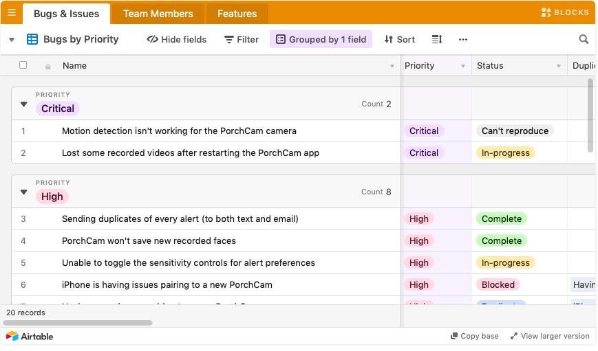 Veri yönetim aracı Airtable tarafından üretilen Bug Tracker, ürünlerinizin hata yönetim sürecini hızlandırmak için tasarlandı. QA analistleri, test mühendisleri ve hızlı büyüyen ekiplerin tercih edebileceği Bug Tracker, ekiplerin hatalar odağında yaptığı iş birliğini kolaylaştırıyor.