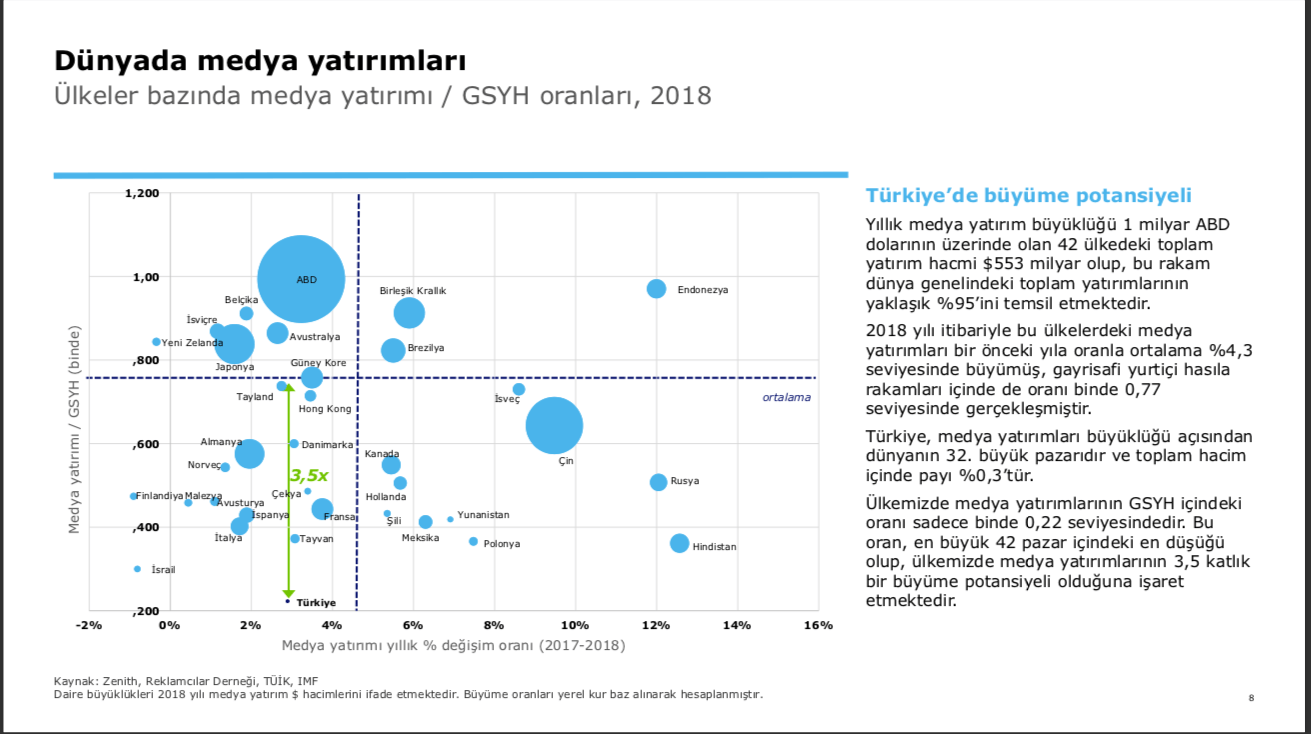 Raporda ülkeler bazında medya yatırımlarına bakıldığında yıllık medya yatırım büyüklüğünün 1 milyar ABD dolarının üzerinde olan 42 ülke bulunduğu görülüyor. Türkiye ise medya yatırımları büyüklüğü açısından 32. sırada yer alıyor. Ancak GSYH oranına bakıldığında sıranın sonunda yer alan Türkiye'nin 3,5 katlık bir büyüme potansiyeli bulunduğunu belirtelim.