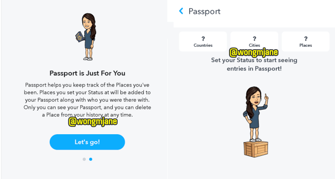 Snapchat'in üzerinde çalıştığı diğer bir özellik olan Snapchat Passport ise bulunduğunuz mekanların kaydını tutuyor. Sadece sizin tarafınızdan görülebilen Passport, ziyaret ettiğiniz tüm mekanların, bu mekanlarda kiminle olduğunuzu ve o mekanlardayken Status özelliğini kullanıp kullanmadığınızı gösterecek. Passport özelliğinin açıklaması ise şöyle: